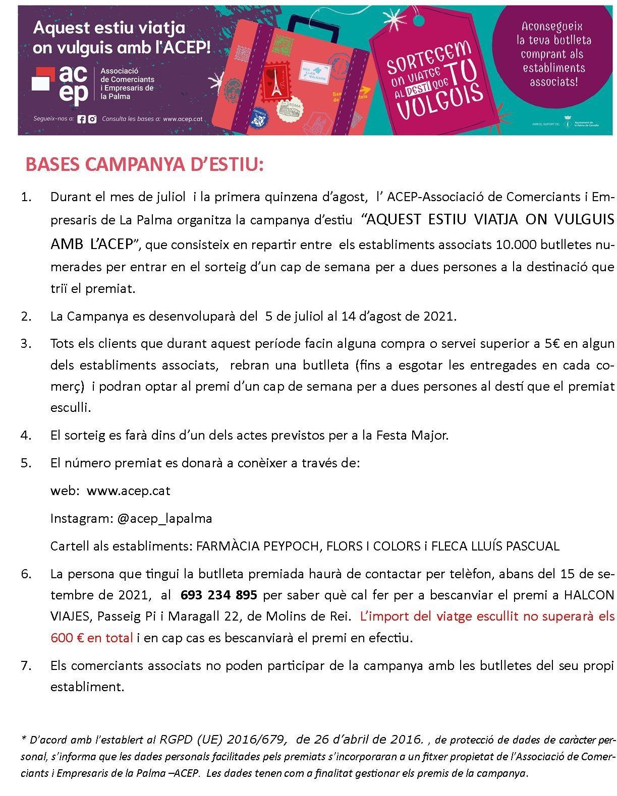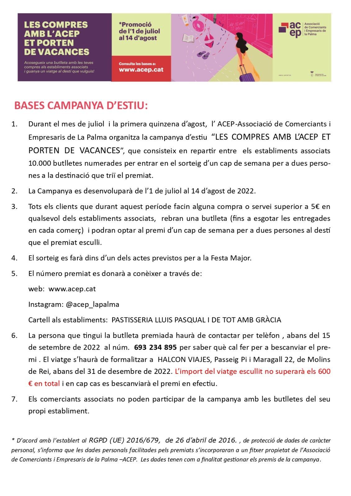 El sorteig es va fer en un dels actes organitzats per a la Festa Major de la Palma. A la mitja part de les Havaneres vam procedir al sorteig, que es va fer públicament i en presència del Regidor de Comerç.